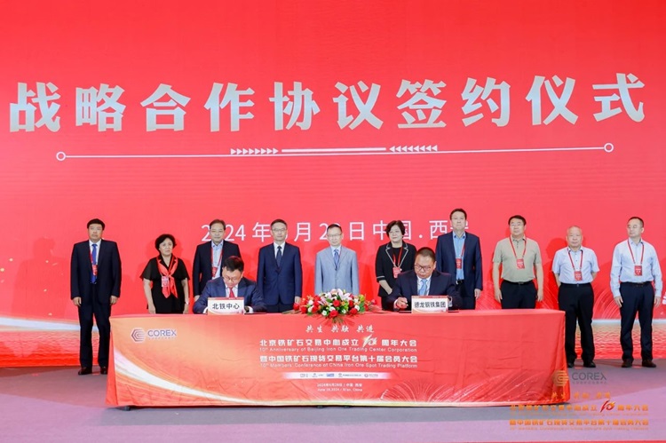 2024年6月28日,北京鐵礦石交易中心(簡稱“北鐵中心”)與德龍鋼鐵集團在西安舉辦戰略合作協議簽約儀式。北鐵中心總裁游松及德龍鋼鐵集團營銷中心總經理李君亮代表雙方簽署協議,中國鋼鐵工業協會副會長駱鐵軍、中國五礦化工進出口商會副會長錢景汾、中國礦產資源集團副總經理紀超等領導出席儀式并見證簽約。