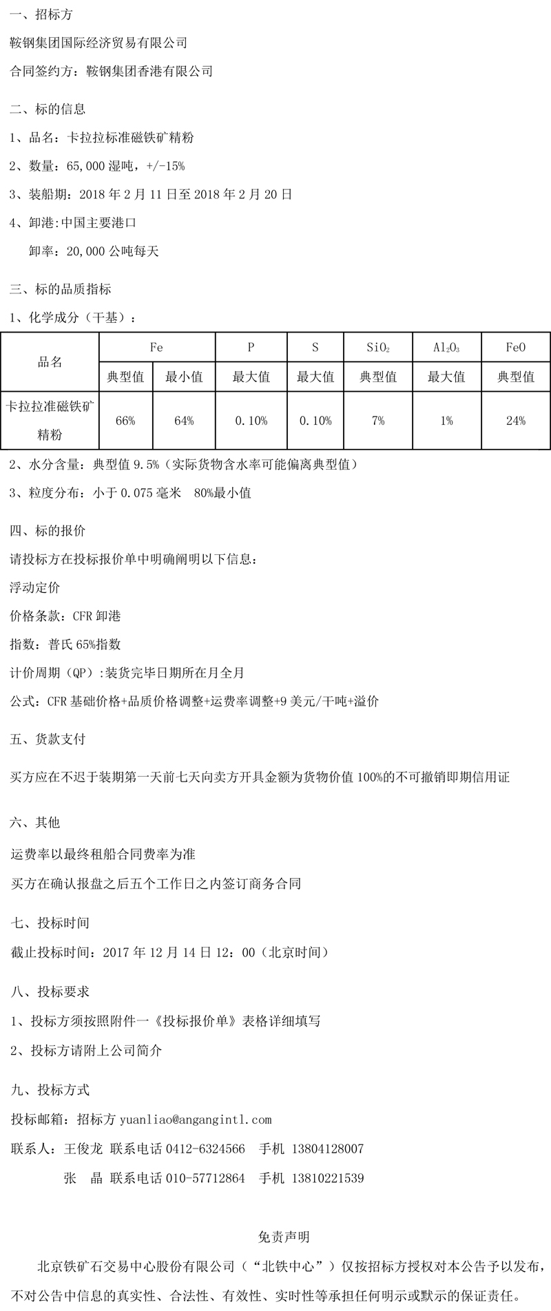 鞍鋼集團國際經濟貿易有限公司鐵礦石銷售招標公告