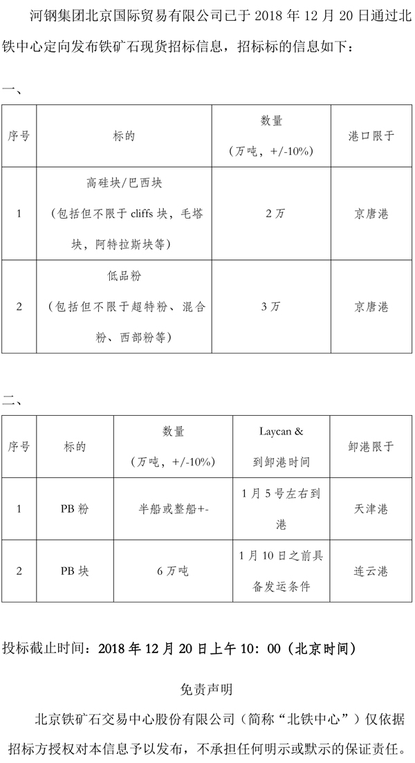河鋼集團北京國際貿易有限公司鐵礦石現貨招標信息