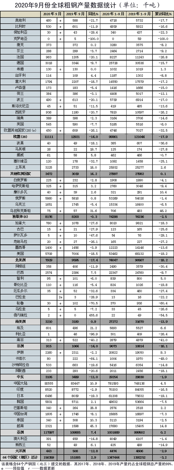9月份全球粗鋼產量同比增長2.9%