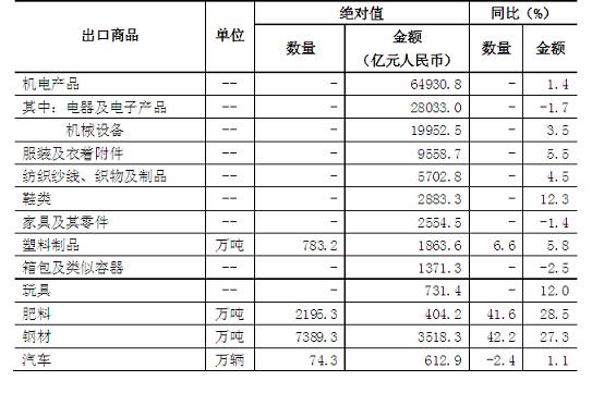 四、機電產品、傳統勞動密集型產品出口增長。前10個月,我國機電產品出口6.49萬億元,增長1.4%,占出口總值的55.5%。其中,電器及電子產品出口2.8萬億元,下降1.7%;機械設備2萬億元,增長3.5%。同期,服裝出口9558.7億元,增長5.5%;紡織品5702.8億元,增長4.5%;鞋類2883.3億元,增長12.3%;家具2554.5億元,下降1.4%;塑料制品1863.6億元,增長5.8%;箱包1371.3億元,下降2.5%;玩具731.4億元,增長12%;上述7大類勞動密集型產品合計出口2.47萬億元,增長5%,占出口總值的21.1%。此外,肥料出口2195.3萬噸,增加41.6%;鋼材7389.3萬噸,增加42.2%;汽車74.3萬輛,減少2.4%(表1)。