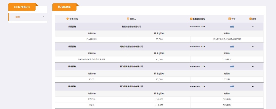 為進一步提升綜合服務(wù)能力,滿足行業(yè)企業(yè)對交易合規(guī)性、便利性和購銷渠道多元化的需求,北鐵中心聯(lián)合廈門國貿(mào)集團等單位,在深入調(diào)研的基礎(chǔ)上推出了鐵礦石現(xiàn)貨電子招標(biāo)系統(tǒng)。據(jù)悉,該系統(tǒng)上線當(dāng)日,廈門國貿(mào)、華菱鋼鐵、河鋼國際、首鋼長治等企業(yè)通過系統(tǒng)發(fā)布招標(biāo)信息,合計30萬噸,購銷品種包括FMG超特粉、巴粗、智利精粉、紐曼粉等品種,交貨地涵蓋天津港、嵐山港、嵐橋港、日照港、青島港、董家口港及江內(nèi)港口。