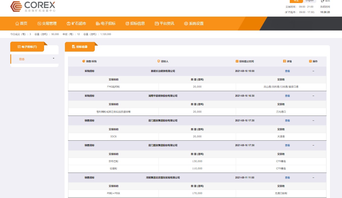 為進一步提升綜合服務能力,滿足行業企業對交易合規性、便利性和購銷渠道多元化的需求,北鐵中心聯合廈門國貿集團等單位,在深入調研的基礎上推出了鐵礦石現貨電子招標系統。據悉,該系統上線當日,廈門國貿、華菱鋼鐵、河鋼國際、首鋼長治等企業通過系統發布采購和銷售招標信息,截止15時30分合計47萬噸,購銷品種包括FMG超特粉、巴粗、智利精粉、紐曼粉、金布巴粉、PB粉、PB塊等品種,交貨地涵蓋天津港、嵐山港、嵐橋港、日照港、青島港、董家口港及江內港口。