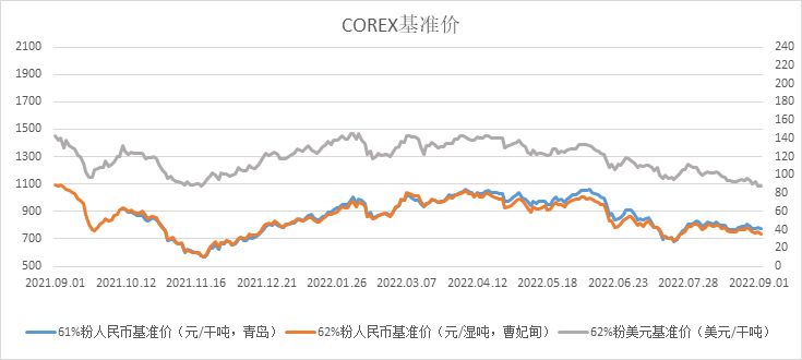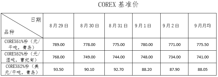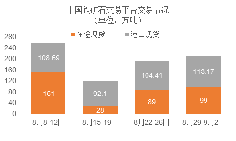 8月29日~9月2日成交94筆共212.17萬噸,其中在途9筆共99萬噸,港口85筆共113.17萬噸。主要成交品種包括:PB粉31筆共80.68萬噸,BRBF 1筆共17萬噸,卡拉加斯粉3筆共1.25萬噸,麥克粉15筆共20.18萬噸,金布巴混合粉7筆8.7萬噸,F(xiàn)MG混合粉8筆共8.2萬噸。
