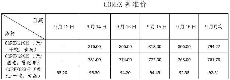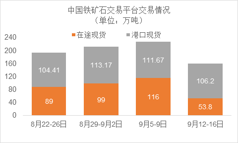 9月12日~9月16日成交103筆共160萬噸,其中在途5筆共53.8萬噸,港口98筆共106.2萬噸。主要成交品種包括:PB粉24筆共28.14萬噸,FMG超特粉15筆共20.81萬噸,FMG混合粉13筆共28.77萬噸,金布巴混合粉13筆共10.1萬噸,麥克粉5筆共4.5萬噸,BRBF 5筆共3.96萬噸,卡拉加斯粉1筆共9萬噸。