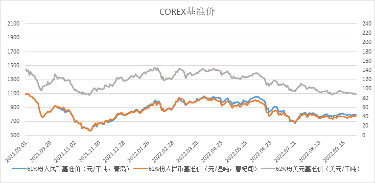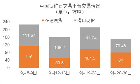 9月26日~9月30日成交69筆共151.48萬噸,其中在途8筆共81萬噸,港口61筆共70.48萬噸。主要成交品種包括:金布巴混合粉13筆共50.5萬噸,PB粉12筆共29.72萬噸,麥克粉8筆共14.87萬噸,BRBF 3筆共4.6萬噸, FMG混合粉1筆共1萬噸,FMG超特粉1筆共0.6萬噸。