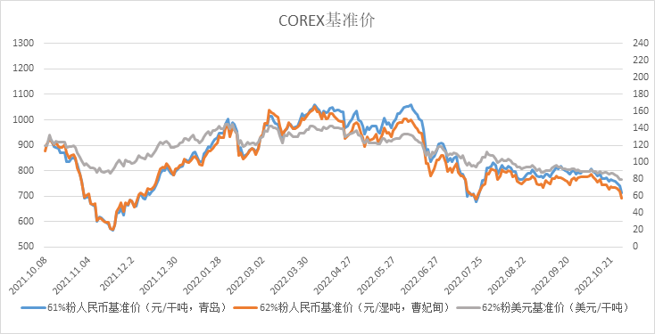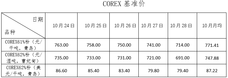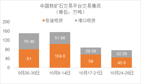 10月24日~10月28日成交40筆共78.09萬噸,其中在途4筆共45.8萬噸,港口36筆共32.29萬噸。主要成交品種包括:金布巴混合粉3筆共11.17萬噸,PB粉8筆共9.05萬噸,FMG混合粉7筆共21.78萬噸,麥克粉3筆共5萬噸,紐曼粉1筆共9萬噸,卡拉加斯粉1筆共3.3萬噸,FMG超特粉2筆共1.1萬噸。