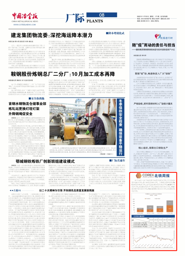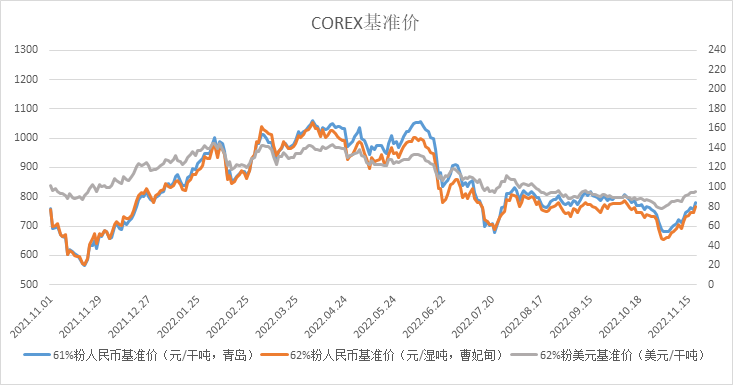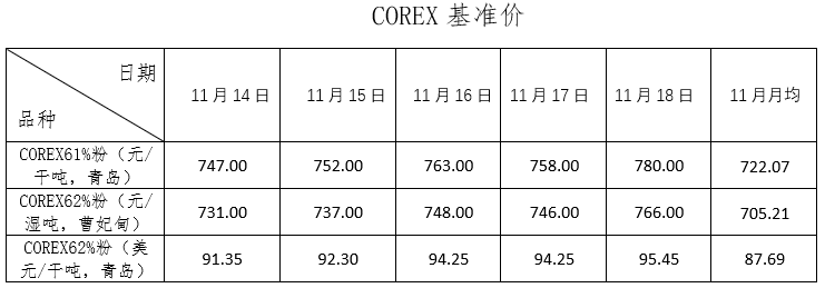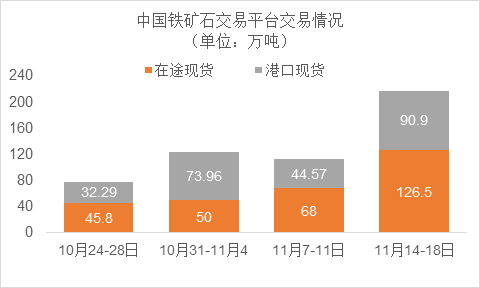 11月14日~11月18日成交94筆共217.4萬噸,其中在途9筆共126.5萬噸,港口85筆共90.9萬噸。主要成交品種包括:PB粉25筆共95.21萬噸,麥克粉2筆共2萬噸,金布巴混合粉9筆共15.2萬噸,紐曼塊3筆共10.1萬噸,揚迪粉2筆共17萬噸,BRBF 1筆共17萬噸,FMG混合粉9筆共12.5萬噸,FMG超特粉6筆共3.3萬噸。