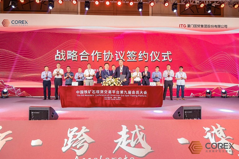 2023年6月15日,北京鐵礦石交易中心(簡稱“北鐵中心”)與廈門國貿集團股份有限公司(簡稱“國貿股份”)舉辦戰略合作協議簽約儀式,公司總裁游松及廈門國貿礦業有限公司總經理李鵬代表雙方簽署協議,中鋼協總經濟師王穎生、五礦商會副會長錢景汾、中國礦產資源集團鐵礦事業部資源平衡總監劉政群等領導共同見證簽約。