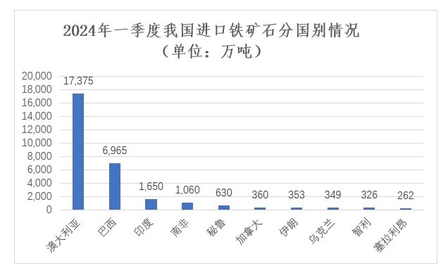 2024年一季度我國共進(jìn)口鐵礦石為31017萬噸,同比增長5.6%;進(jìn)口額為401.4億美元,同比增長16.7%;進(jìn)口均價(jià)為130美元/噸,同比上漲10.6%。