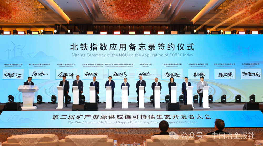 11月6日,在第三屆礦產資源供應鏈可持續生態開發者大會上,中國礦產資源集團國際供應鏈有限公司、上海德龍鋼鐵集團有限公司、天津建龍鋼鐵實業有限公司、廈門國貿集團股份有限公司等10家鋼鐵產業鏈上下游重點企業共同簽署北鐵指數應用備忘錄,將逐步在鐵礦石貿易中采用北鐵指數作為結算依據。